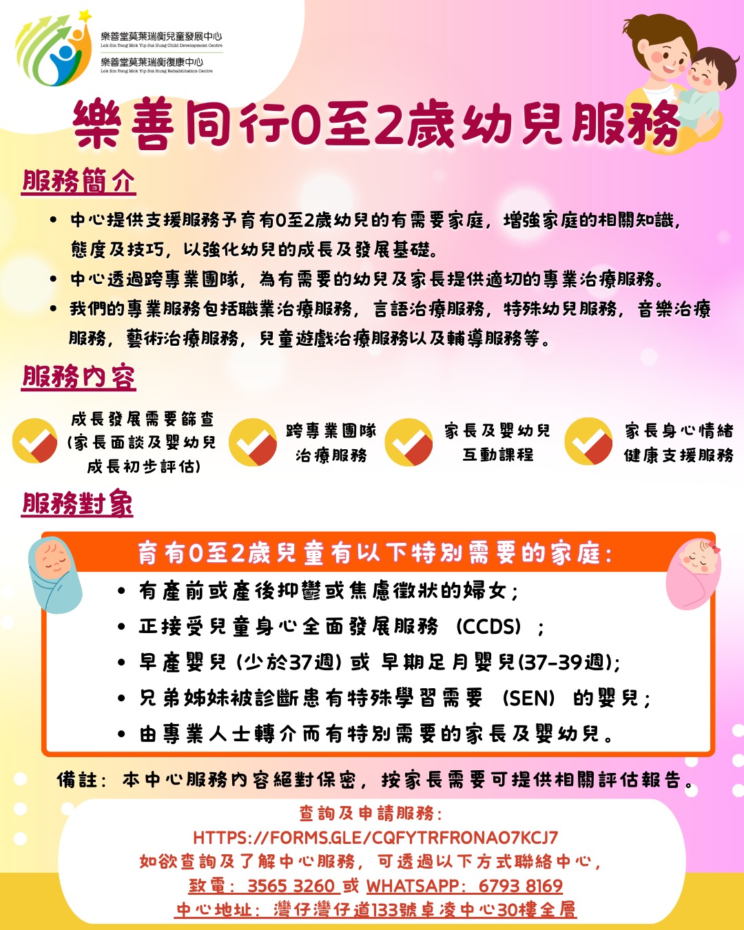 0-2歲是兒童發展的黃金期,此階段的治療服務主要為「早期介入」,我們利用跨專業的評估與治療,並緊密結合家庭,為幼兒建立健康發展的基石。 中心提供個別專業評估、物理治療、職能治療、言語治療等,針對成長、社交、學習、體能等問題。我們強調一對一訓練,指導家長家居訓練,幫助孩子克服發展瓶頸。